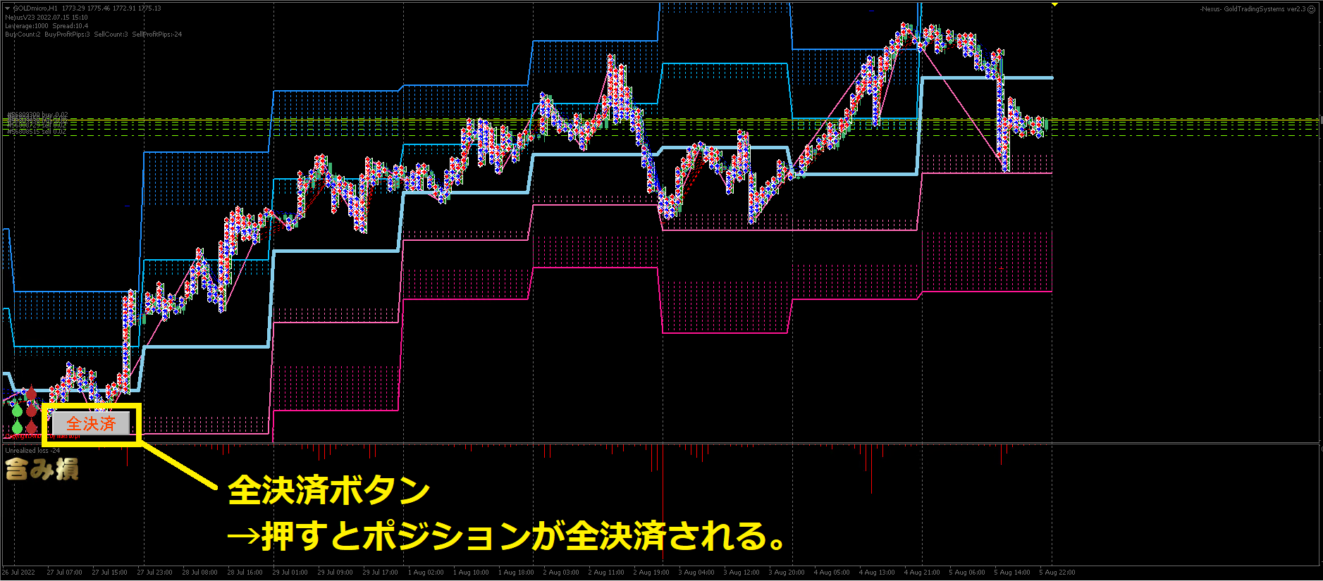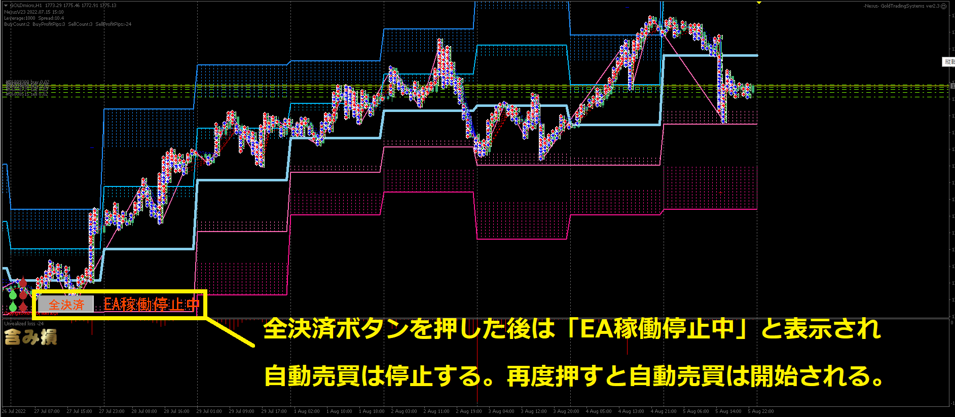 “全決済ボタン”といって、その名の通りクリックすると保有ポジションが強制的に全決済されます。押した後は「EA稼働停止中」と表示され自動売買が停止します。再度ボタンを押すと自動売買が再開されます。